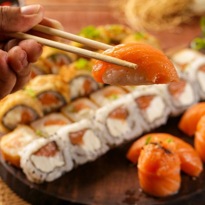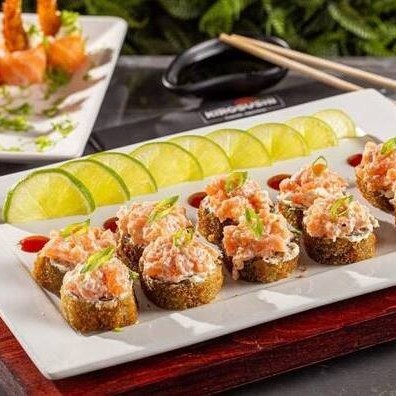 Sushi deliciosamente preparado com Salmão cuidadosamente selecionado, Cream Cheese Original, empanado, frito e finalizado com uma cobertura de Pasta de Salmão.