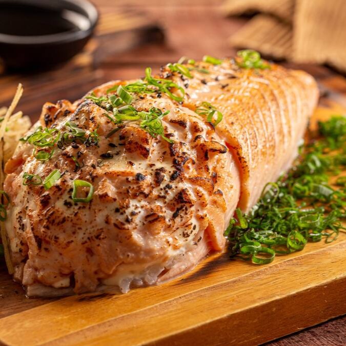 Deliciosamente preparado com de Arroz Japonês, uma camada generosa de de Pasta de Salmão, Cream Cheese Original e extra cremoso, finalizado com uma manta de filé de Salmão Maçaricado.