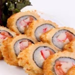 Lamina de kani com salmao e cream cheese empanado e frito.