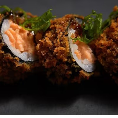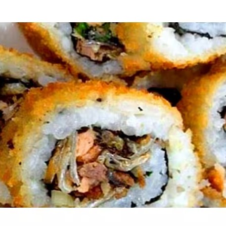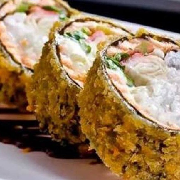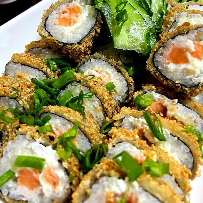 Arroz, cream cheese, salmao e kani Envolvido No Nori, Empanado E Frito.