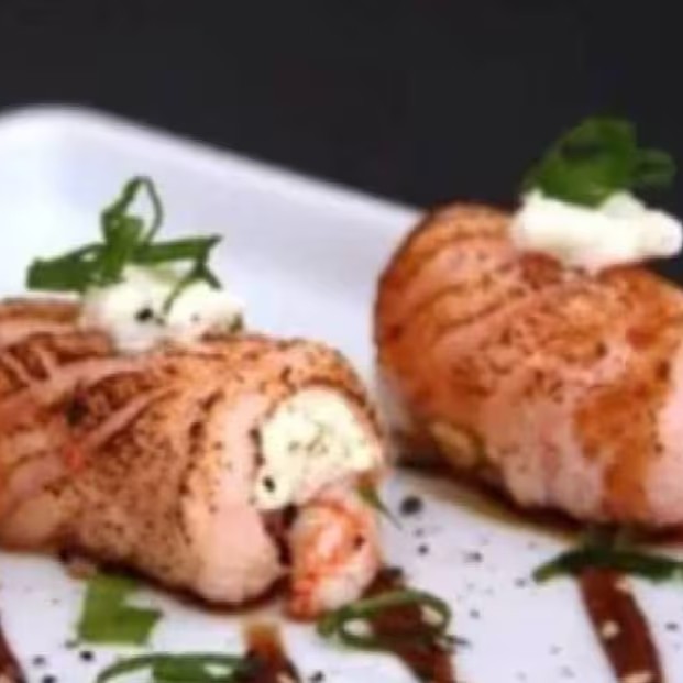 Lamina De Salmao Recheado Com Camarao E Cream Cheese.