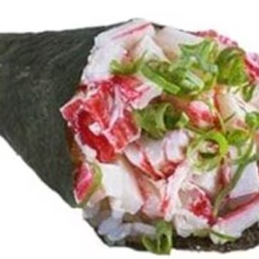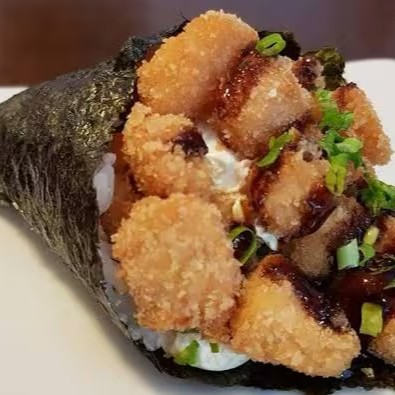 Enrolado em cone com arroz, com recheio de kani em cubos com cream cheese.