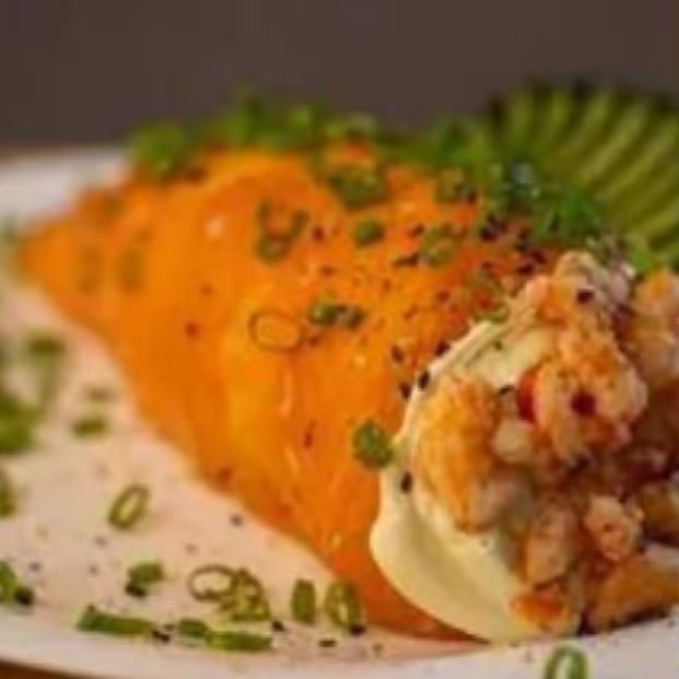 Enrolado em cone com arroz, com recheio de salmão com cream cheese e camarão crock por cima.