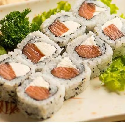 Combina o sabor intenso do salmão grelhado com o cremoso cream cheese e a frescura da cebolinha, tudo envolto em uma porção generosa de arroz.