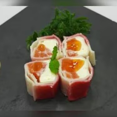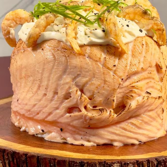 Enrolado em manta de salmão maçaricado, recheado com arroz, cream cheese, skin e camarão crock.