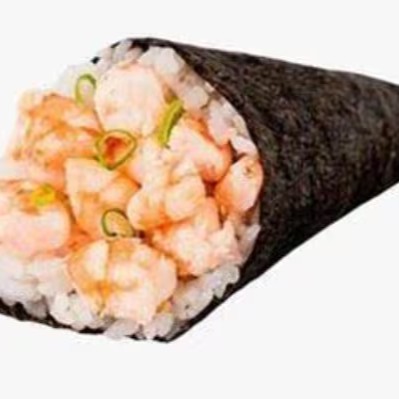 Enrolado em cone com arroz, com recheio de camarão cozido com cream cheese.