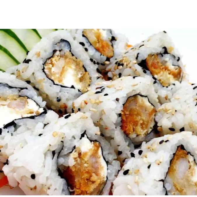 Arroz Com Gergelin Recheado Com Nori, Camarao empanado E Cream Cheese.