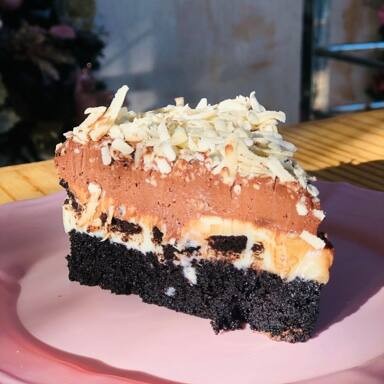 Torta com massa molhadinha de chocolate 75% cacau, 2 camadas de recheio cremoso generosos - brigadeiro de leite ninho e brigadeiro de chocolate belga