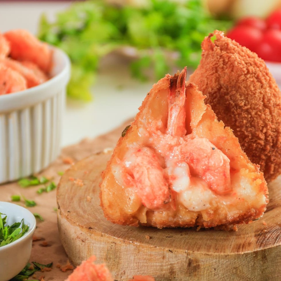 Coxão de camarão com casquinha crocante com recheio de camarão em pedaços e Catupiry.