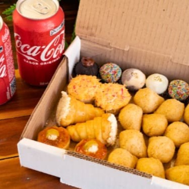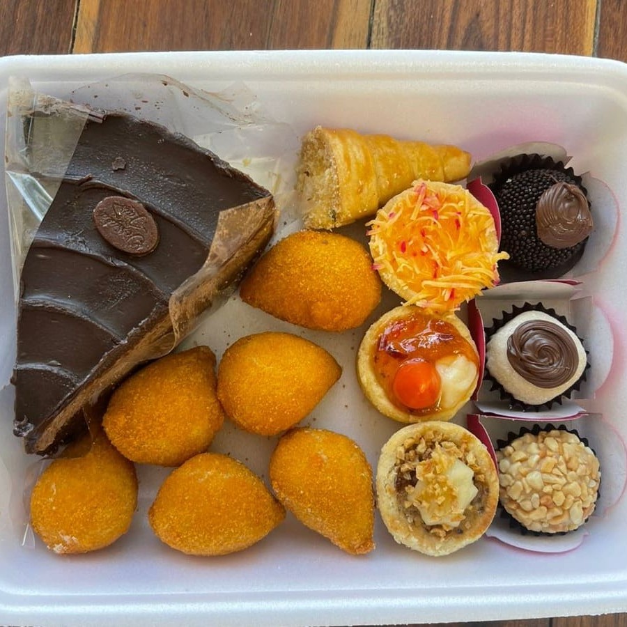 Caixa com : 1 Fatia de Torta* / 3 Doces gourmet/ 4 Salgados de Forno* / 6 mini Coxinhas fritas. * itens a escolha do cliente de acordo com a disponibilidade da loja, favor consultar no chat!!