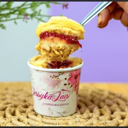 Pote 220ml Com massa de bolo amanteigada molhadinha com recheio super cremoso de leite ninho com geleia azedinha artesanal de morango
