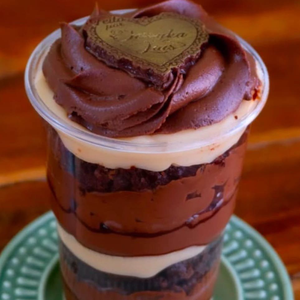 Pote com bolo molhadinho de chocolate 75% e camadas de rehceios cremosos de ninho e chocolate belga