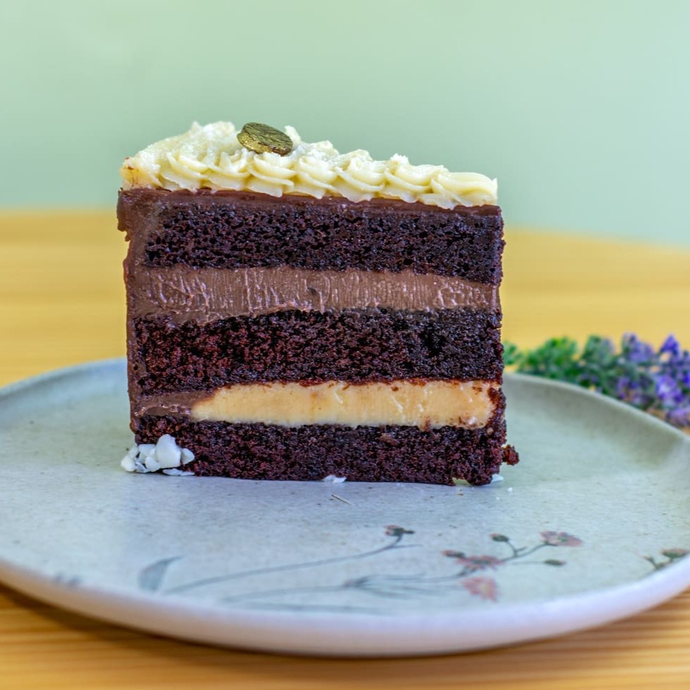 Torta com massa molhadinha de chocolate 75% cacau, 2 camadas de recheio cremoso generosos de doce de leite e brigadeiro de chocolate belga