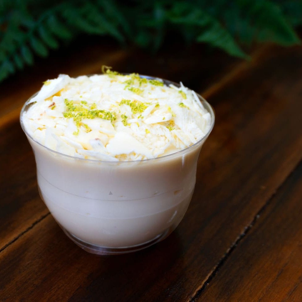 Mousse de Limão super Cremoso e feito 100% com sumo da fruta do limão. Com raspas de chocolate branco.
