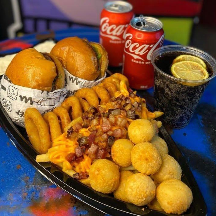 2 Hamburguers Porção de batata especial + Porção de coxinha + Porção de onions rings + 2 Refrigerante lata