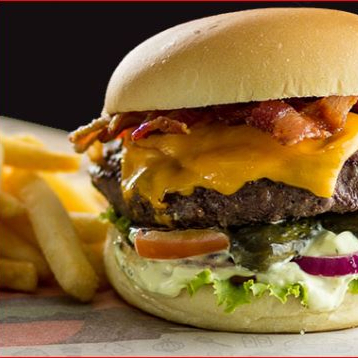 Hamburguer artesanal, queijo cheddar, bacon , alface, tomate, cebola caramelizada e maionese da casa.