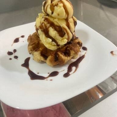 Waffle com sorvete 1 bola e calda: Escolha o sabor e a calda.