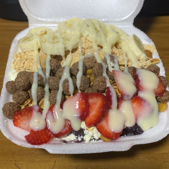 Açai de 300ml vem com 4 complementos, bem recheado e cremoso do jeito que você gosta!