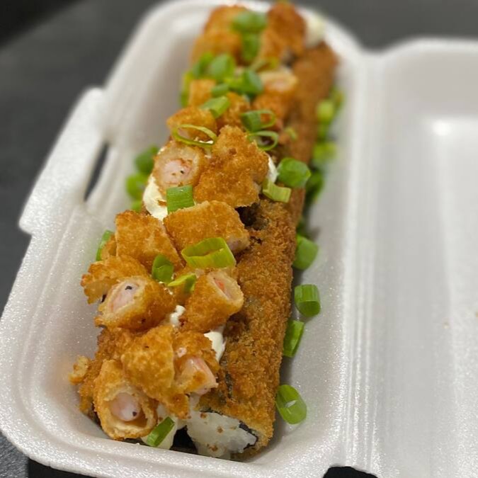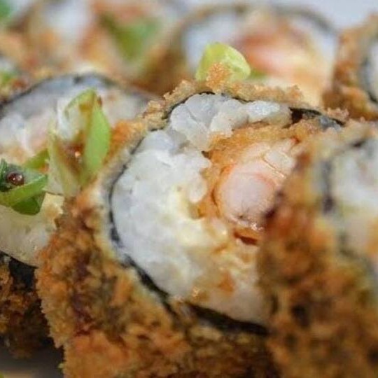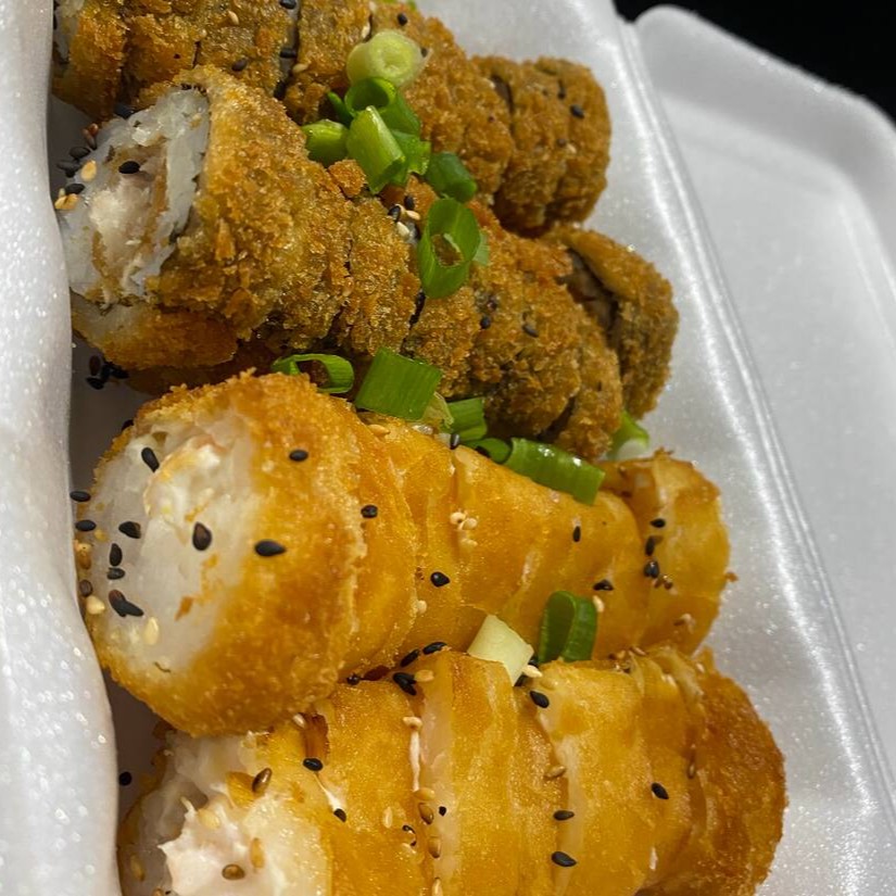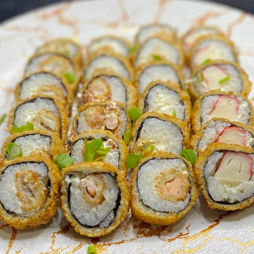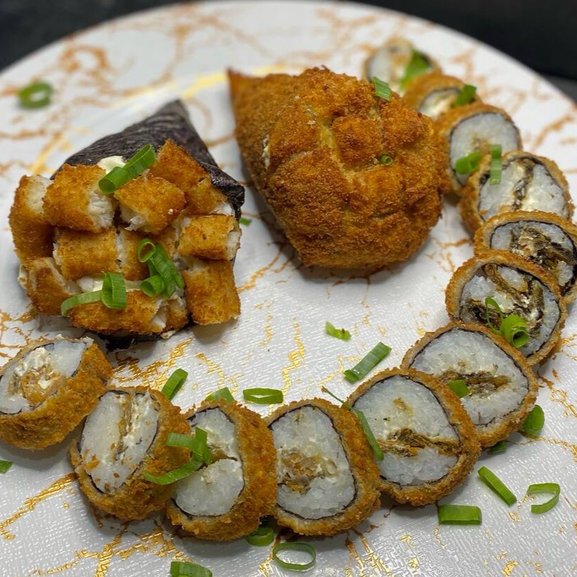 Shari (arroz japônes) enrolado no nori, com recheio de creme cheese e sabor de sua preferência, frito.