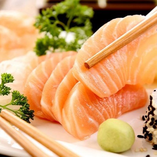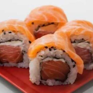 Shashi (arroz japônes) por fora com gergilim, enrolado com nori, com recheio de salmão e creme cheese, com mais salmão por cima.