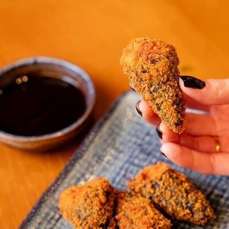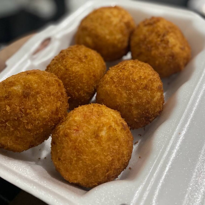 Coxinha sem massa, feita na hora, o recheio de sua preferência misturado com creme cheese, empanado na farinha panko, e frito.