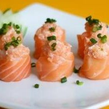 Shari (arroz japônes) enrolado na lâmina de salmão com patê de salmão com creme cheese em cima.