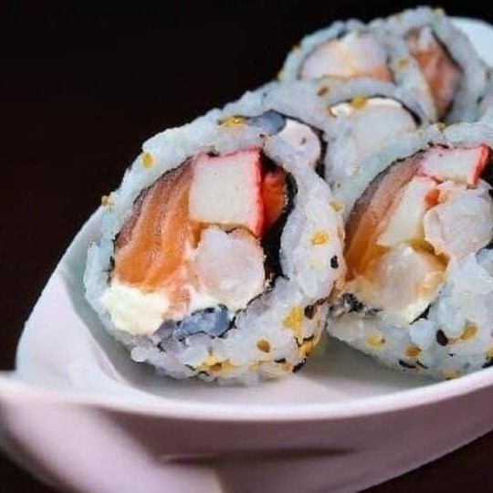 Shari (arroz japônes) com gergelim torrado, enrolado no nori, com recheio de creme cheese e sabor de sua preferência.