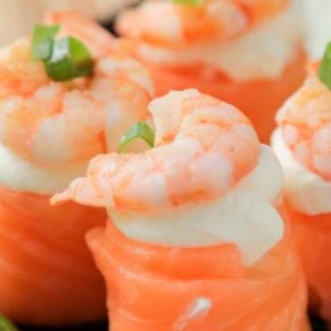 Enrolado na lâmina do salmão, com recheio de creme cheese e camarão empanado.