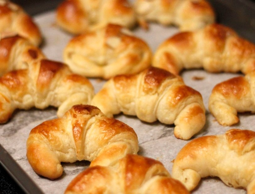 Porção com 4 mini croissants Galo Padeiro. Acompanha manteiga de café.