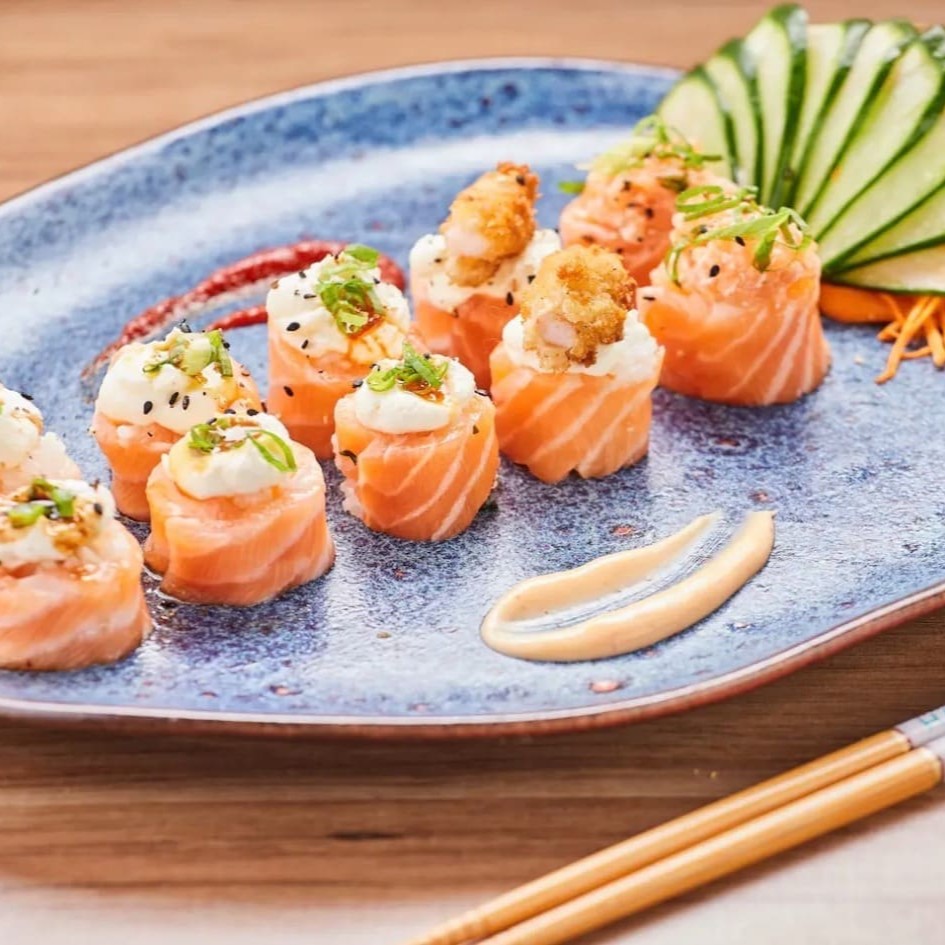 Lâminas de salmão envolvendo arroz, com cream cheese no topo, acompanhadas de molho de maracujá, geleia de pimenta, camarão frito, pasta de salmão e teriyaki. Finalizado com cebolinha e gergelim para um toque especial. Uma explosão de sabores!