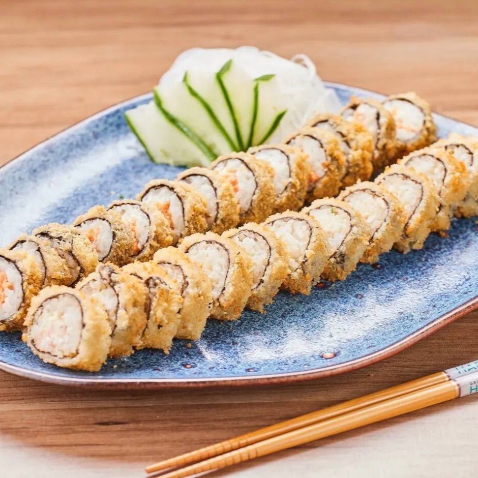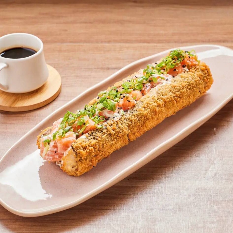 Crocância e sabor em uma só peça! Nossos hot rolls são empanados e fritos até ficarem dourados, com recheios deliciosos que elevam essa experiência única da culinária japonesa. Foto: Hot de salmão.