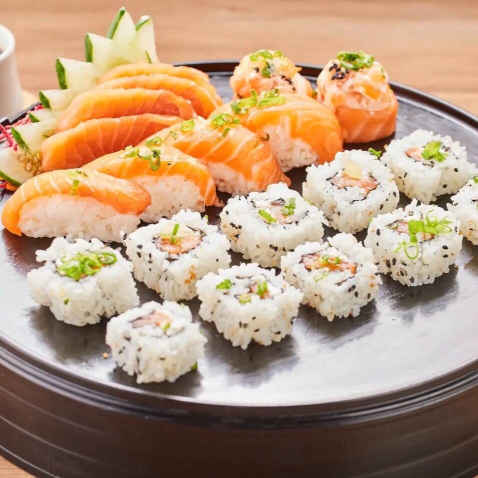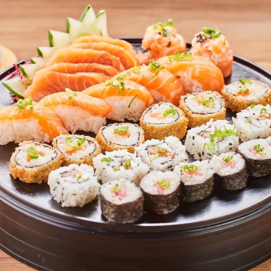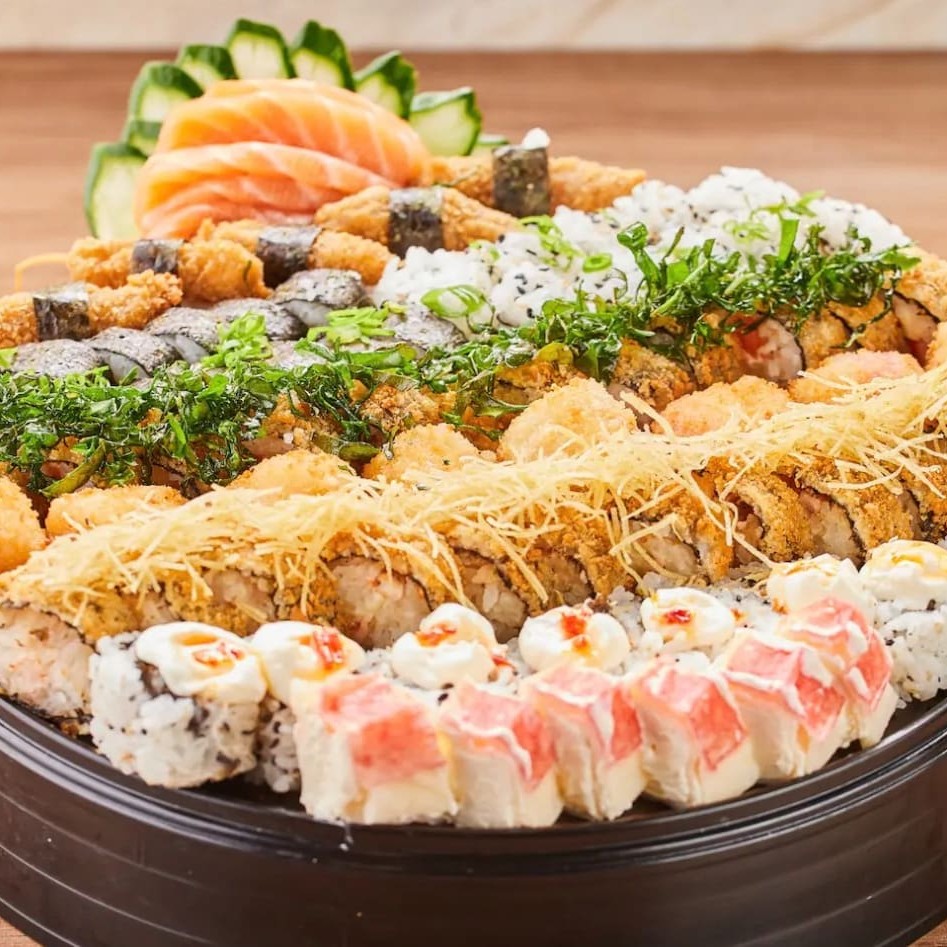 Sabores e texturas! Um mix de 53 peças que vai surpreender seu paladar com camarão frito, salmão e outros ingredientes orientais perfeitos.