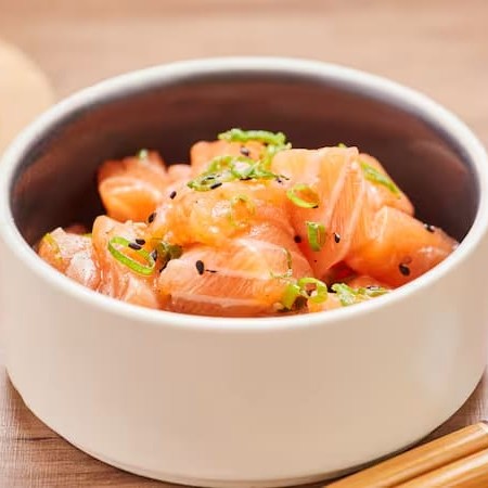 Frescor e leveza em cada mordida! Escolha entre salmão, atum ou a combinação perfeita dos dois (mista). Temperados com azeite, finalizados com cebolinho e um toque de gergelim, nossas saladinhas são a opção ideal para quem busca sabor e sofisticação! Foto: Saladinha de salmão.