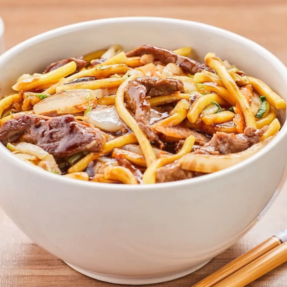 Carne suculenta e mix de legumes no macarrão yakisoba frito, com o irresistível toque do molho shoyu e especiarias orientais.