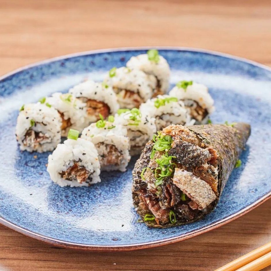 28 peças de pura explosão de sabor: acelga maki de pasta de atum com couve crispy, acelga maki de pasta de salmão com batata crispy e hot roll de pasta de atum empanada com cream cheese.