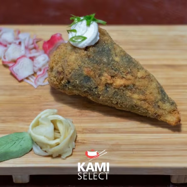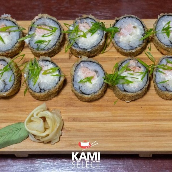 Alga, arroz, cream cheese, peixe branco, empanado e frito