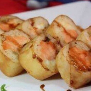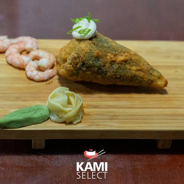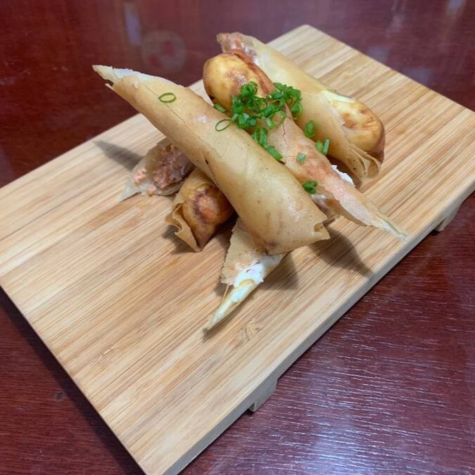 Massa de Harumaki, arroz, cream cheese, kani e cebolinha.