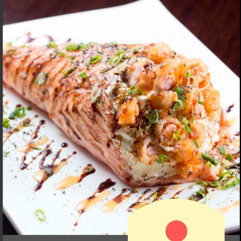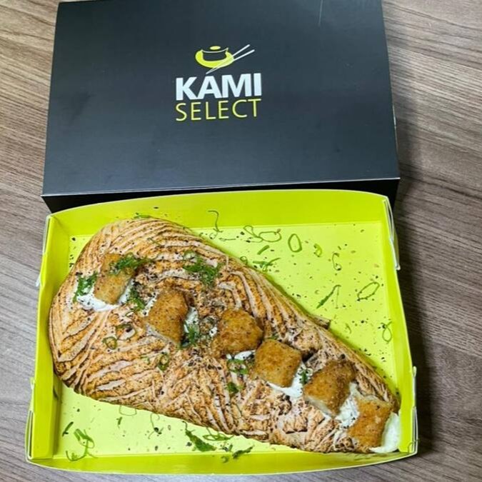 Manta de salmão flambada, com recheio de arroz, cream cheese, camarão empanado, cebolinha e gergelim! (Aproximadamente 400 Gramas)