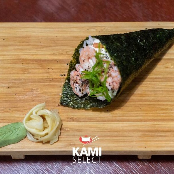 Alga, arroz, cream cheese, camarão cozido, cebolinha e gergelin.