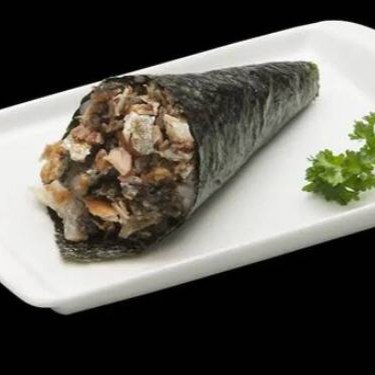 Salmão frito, arroz, cebolinha e gergelim. (Por fora o temaki é natural)