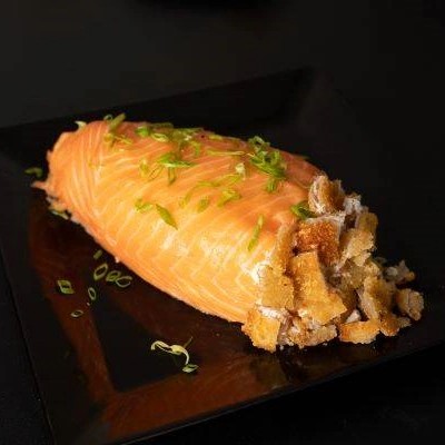 Lâmina de salmão recheada com arroz, camarao empanado e cream cheese. Finalizado com camarao natural (Aprox 1,2kg) - Acompanha: 60ml de teriyaki e 2 sachês de shoyu