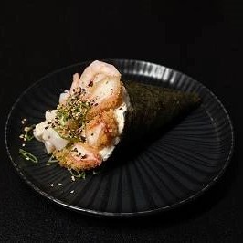 Bolinho de arroz com gergelim, recheado com nori (Folhas de algas marinhas), camarão e cream cheese. (10 Peças) - Acompanha: 30ml de teriyaki e 1 sachê de shoyu