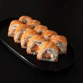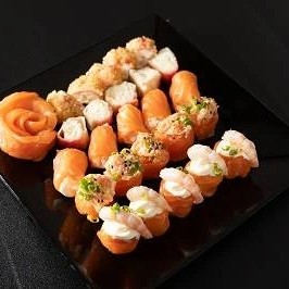 Camadas de arroz japonês recheado com sabores a sua escolha, cream cheese, coberto com uma manta de salmão (aprox 350gr) - Acompanha: 30ml de teriyaki e 1 sachê de shoyu