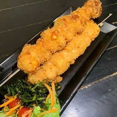 Espeto de camarões e queijos empanados na farinha japonesa (01 Unidade).