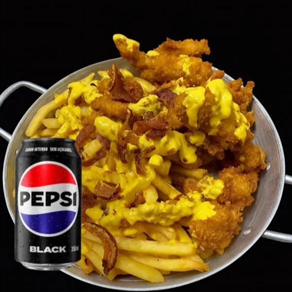 Deliciosas batatas fritas crocantes , cobertas com cheddar derretido , acompanhadas de bacon crocante e tiras de frango empanados. Uma combinação irresistevel para quem ama sabor . obs: Na falta de pepsi , será substituído por guaraná antártica zero)