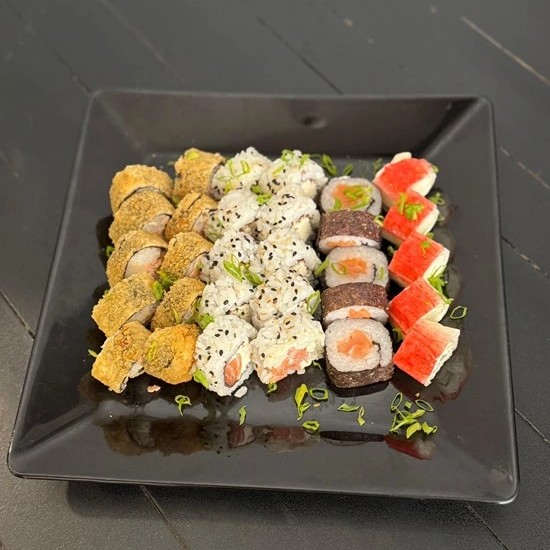 10 Carioca, 10 Uramaki, 10 Hossomaki, 5 Kani Queijo, 5 Nigiri, 5 Sashimi. - Acompanha: 60ml de teriaki e 2 sachês de shoyu. Obs: Não realizamos troca de peças.
