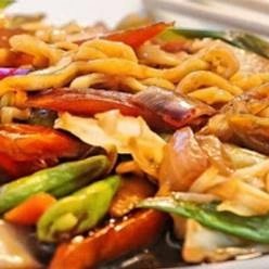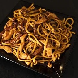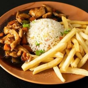 Filé de peito em cubos com pimentão, cenoura, cebola, cebolinho ao molho de soja, acompanha risoto (Arroz, ovos, presunto e ervilha). Na porção individual também acompanha batata frita.
