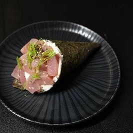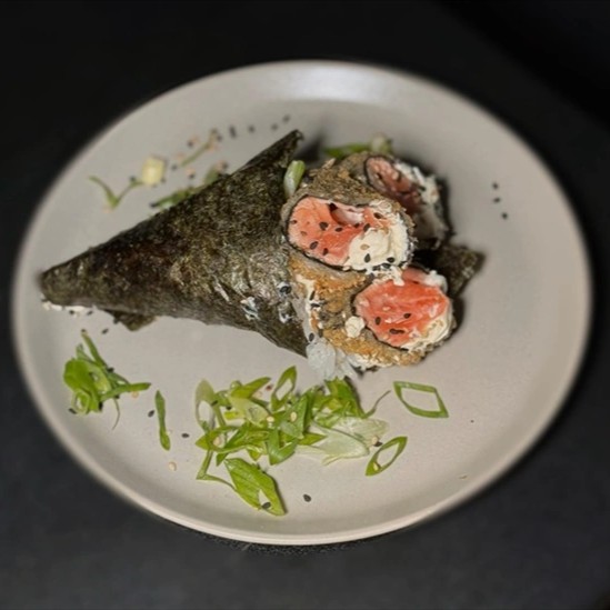 Um temaki gigante feito com arroz japonês , salmão fresco em cubos e o inconfundível cream cheese polenghi, todo empanado , frito até ficarcrocante e finalizado com cebolinho fresco, que traz equilíbrio e levesa ao sabor . servido em tábua de madeira ,com uma faca de cabo rústico cravada no centro , sua apresentação é tão ousada quanto o prato em si . Uma verdadeira experiência gastronômica para quem não tem medo de encarar sabor e tamanho em versão OGRO (aproximadamente1,3kg