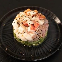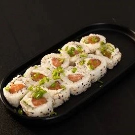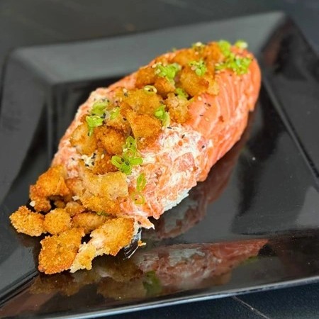Fina camada de arroz, cubos de salmão,cream cheese, cebolinho, maionese (levemente apimentada ), crispy de cebola, finalizado com teriaki e gergelim. Acompanha 30ml de teriaki e 1 sashê de shoyu.