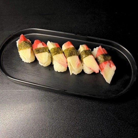 Bolinho de arroz prensado com lâminas de kani. (6 Peças) - Acompanha: 30ml de teriyaki e 1 sachê de shoyu